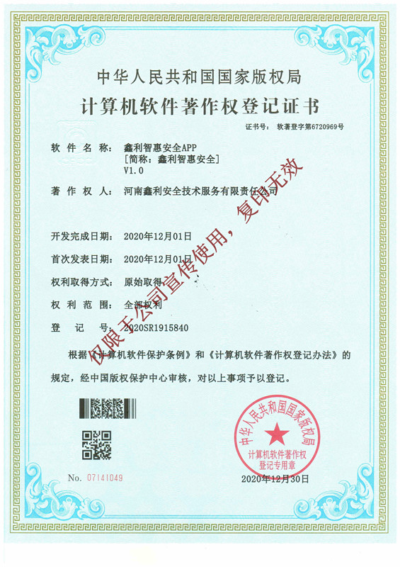 鑫利智慧安全APP軟件著作權(quán)登記證書